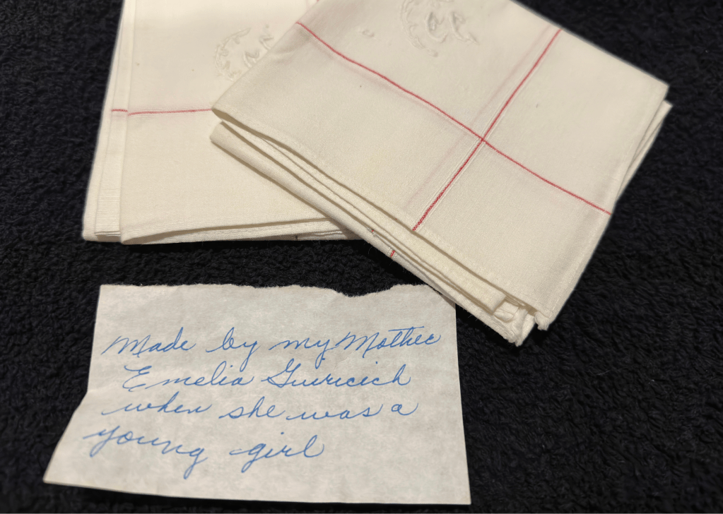 Personal Connection: This handkerchief is my Great Great-Grandmother’s, which she handmade herself. Her name was Emelia Giuricich, and I received my name from her.