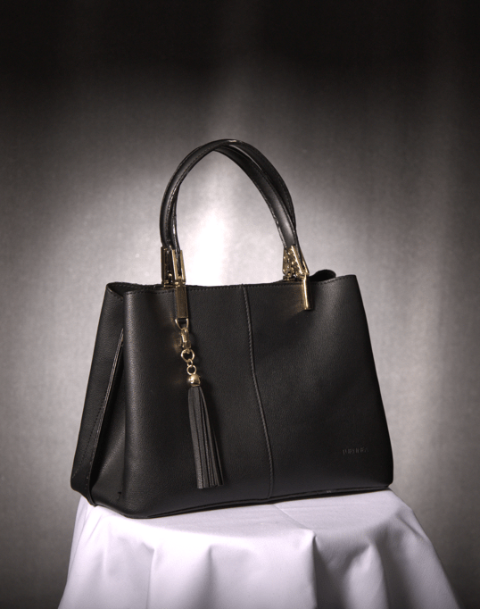 Brief description: A black bag with some gold detailing on the handles and the tassel holder Physical description: This black handbag with gold detailing presents a sleek and polished exterior crafted from high-quality leather. The smooth texture of the black leather exudes sophistication, while the gold detailing, including the zipper pulls, metal accents, and logo embellishments, adds a touch of opulence. The gold elements create a striking contrast against the black background, catching the eye and elevating the bag’s overall aesthetic. The structured design and reinforced handles showcase a commitment to both style and durability. When opened, the interior reveals a well-organized space with various compartments, all accentuated by the interplay of black and gold elements, creating a visually appealing and cohesive look. This handbag combines classic elegance with luxurious detailing, making it a versatile accessory for both formal and casual settings.