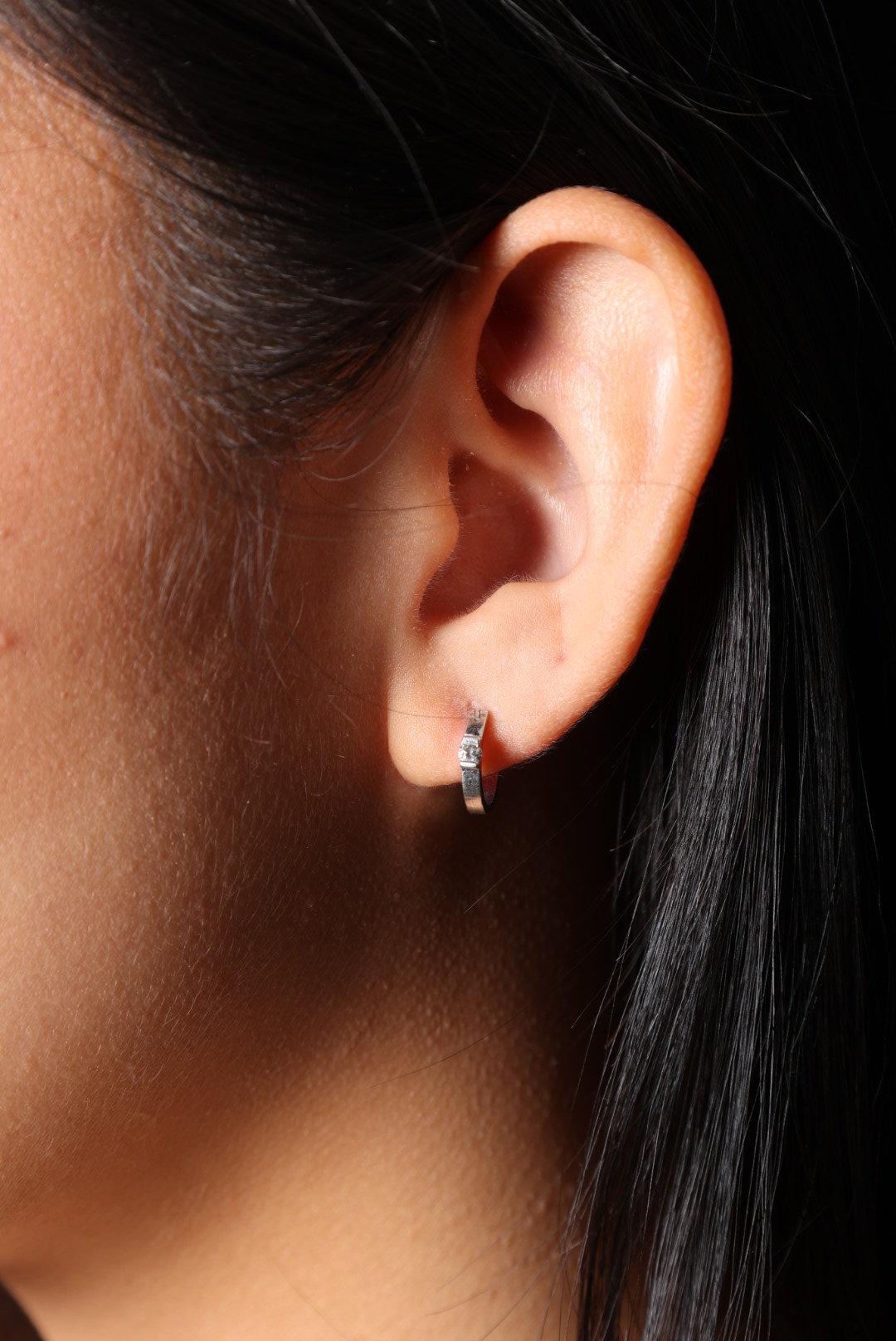 Brief Description: White gold earrings made for infants with diamond embellishment Physical Description: White Gold 14K Earrings, Cuff Style, One statement diamond Purpose: As an accessory for children or infants