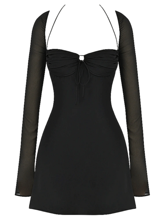 Brief description: a black mini dress cut from georgette fabric with halter neck ties and bell sleeves. It also features underwire cups and a small drawstring in the bust area for adjustment.